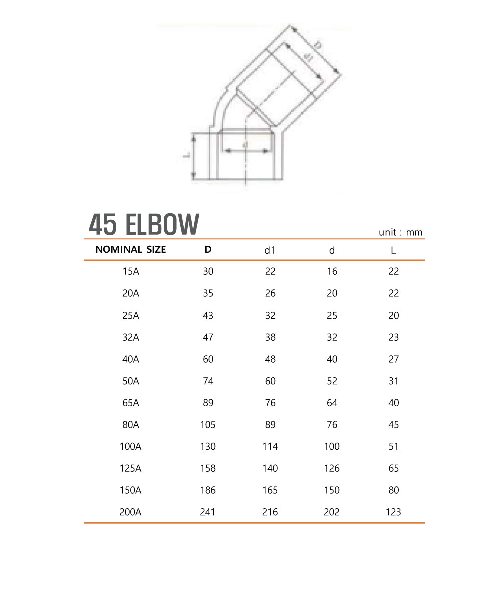 PP 45 ELBOW 목록 본문 > < ----PP 45도 엘보 치수표 PP 45 ELBOW e-mail : phone : body : SPEC SPEC| ----PP 45도 엘보 치수표 수량 개 RELATED PRODUCT 보내기 취소 목록