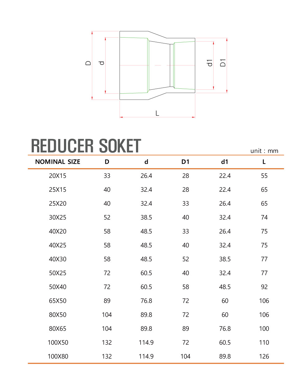 PVDF REDUCER SOCKET 목록 본문 > < ----레듀샤 소켓 치수표 PVDF REDUCER SOCKET e-mail : phone : body : SPEC SPEC| ----레듀샤 소켓 치수표 수량 개 RELATED PRODUCT 보내기 취소 목록